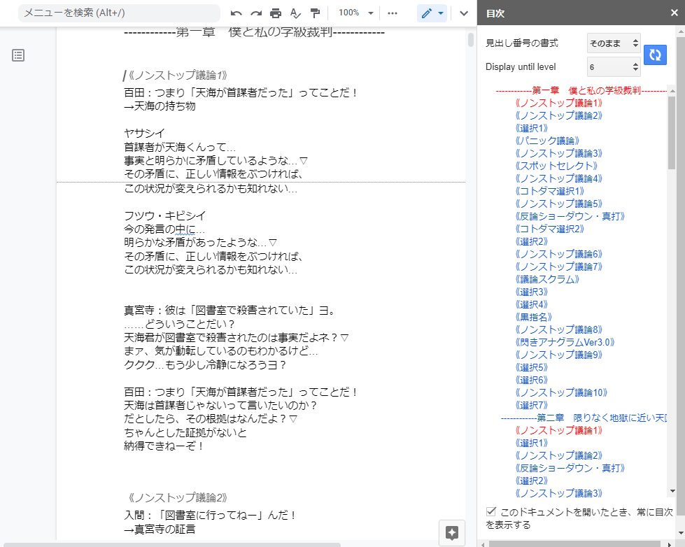 これは別ゲーの台詞纏めの時から使っているんだけど、「Table of contents」のアドオンを使っています。翻訳すると「目次」、そのまんまだ。常に画面に目次が表示されるようになり、リンクで飛べます。