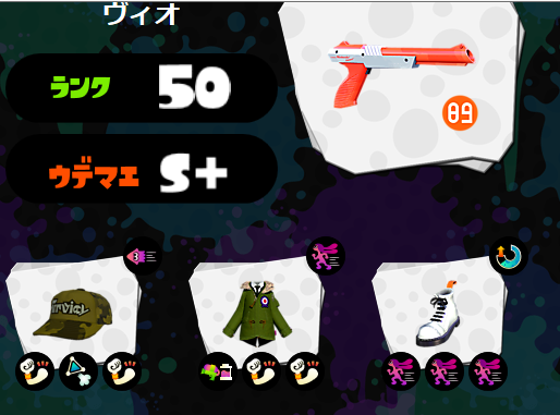 ちなみにパブロの時はスペ増+攻撃の組み合わせを使用してる。イカ速も使ったり。一番長い付き合いなので、色々な組み合わせで遊んでる。