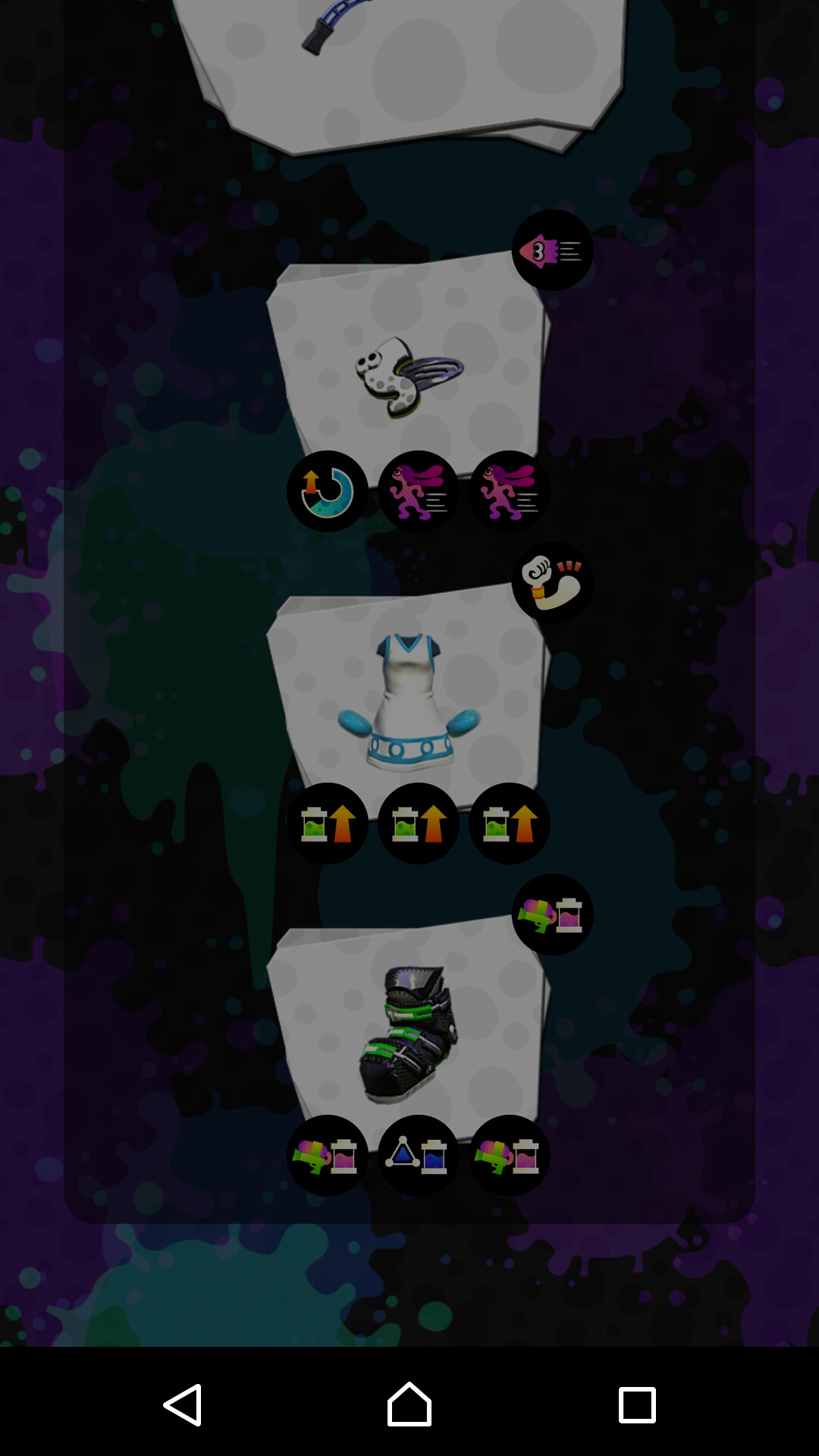 イカ速はメインに一個あるのとないのとで全然感覚が違うなぁって思う。まあメインは一個しか手持ちにないんだけどね。自分はあまりギアを重視してなくて、見た目が好きなものしか買ってないんです。