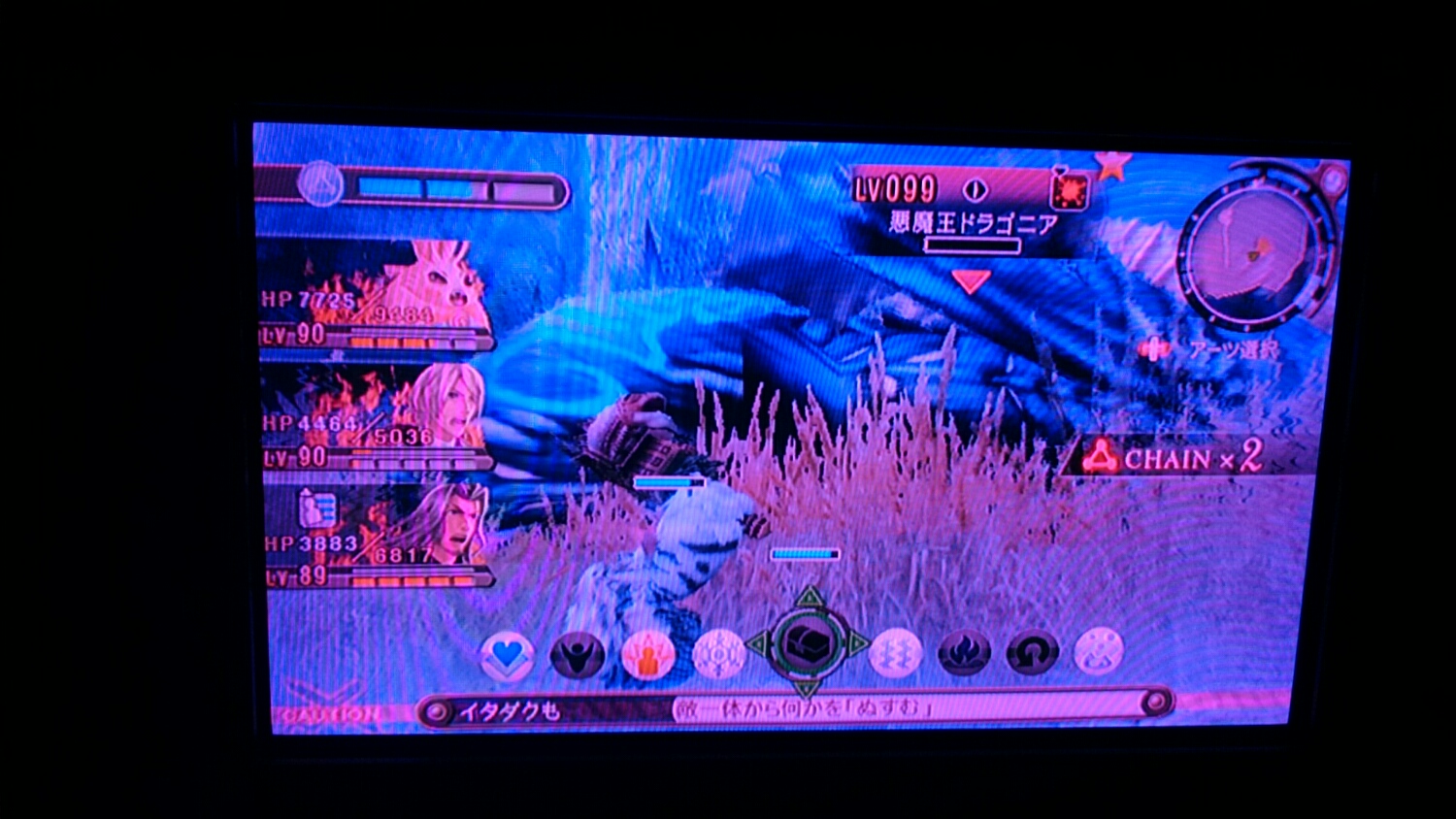 7人パーティだと二枚に収まらないよ、リキ……。それとブラウン管だから上手く撮れねーんです……。それぞれの装備画面も撮ったけどあまりに微妙なため、二周目終わった頃に薄型液晶で撮り直すかも。本当はキャプチャでなんとかしたいが……Wiiの三色線何処にあったかなぁ。それでしかキャプチャ出来んので。