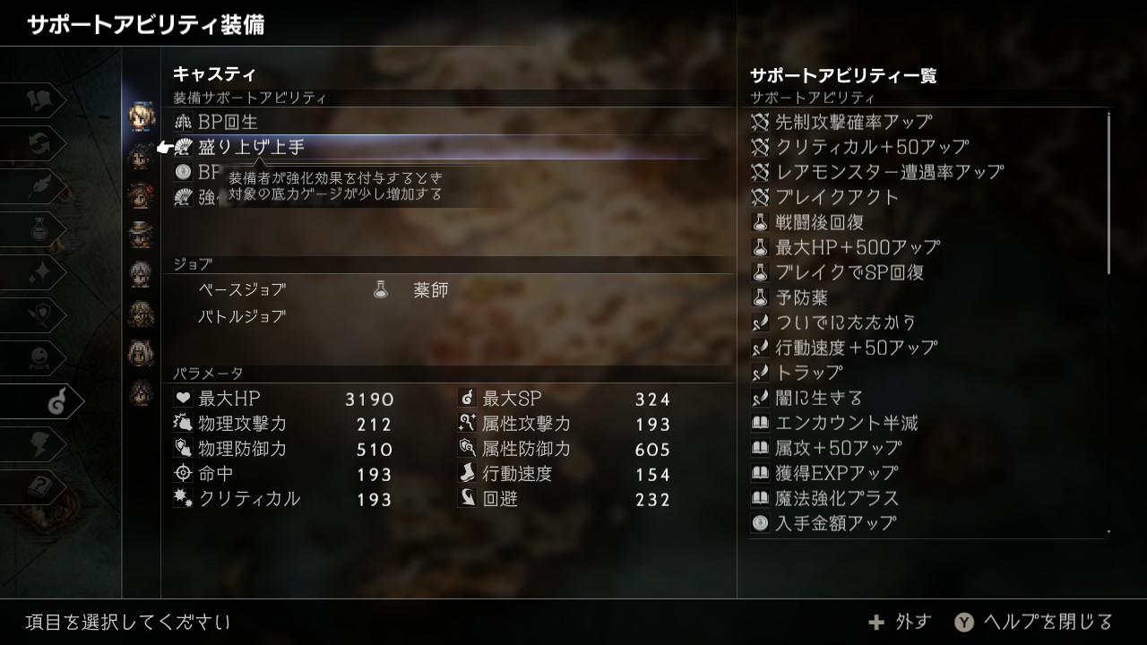 百薬を使わないにしても、薬師の「健全化」やキャスティの「調合」により恩恵は得られるので、キャスティ使いはつけて普段からつけておくことを薦めたい。