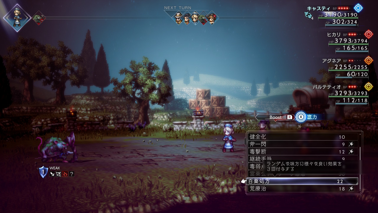 オクトラ2でキャスティの章をクリアすると使えるようになる「百薬処方(En.Remedy)」という技があります。