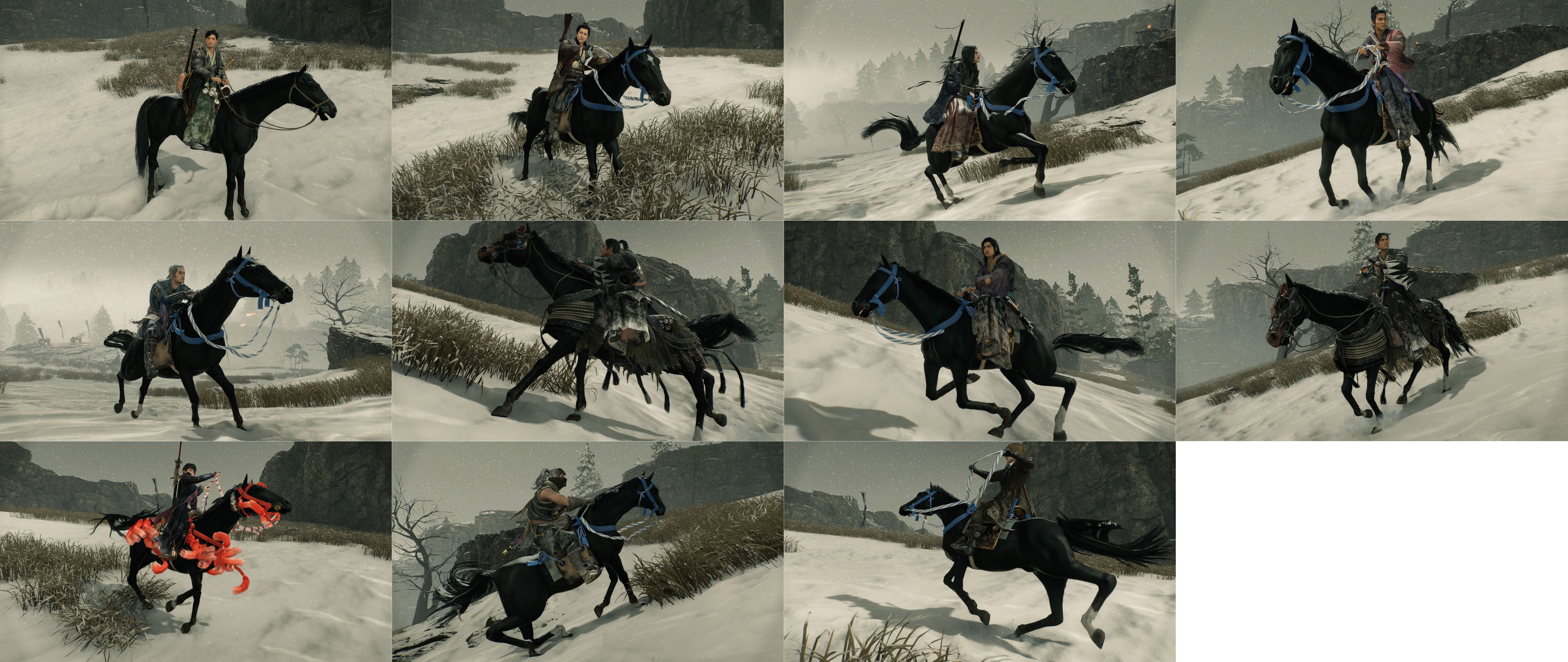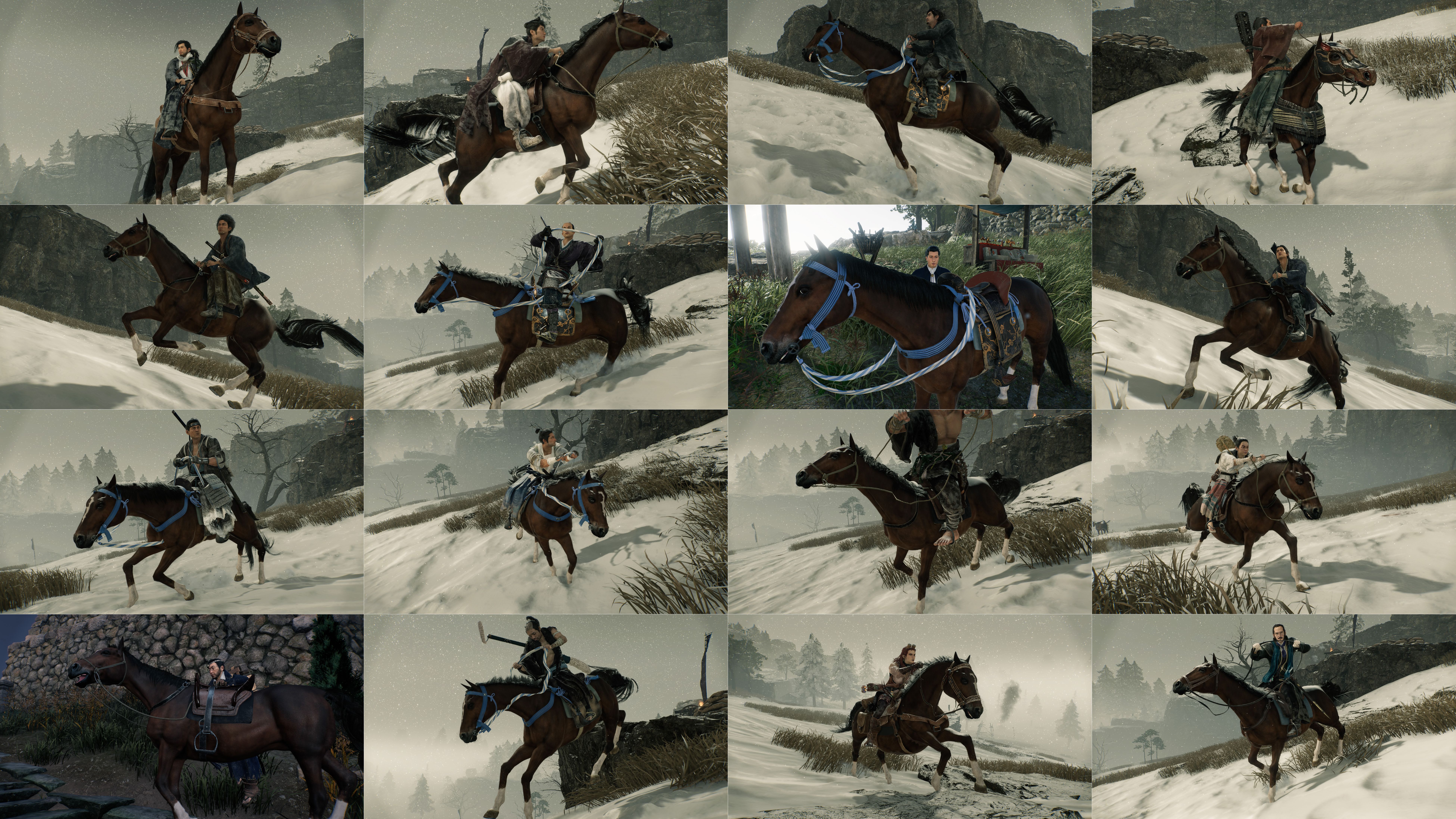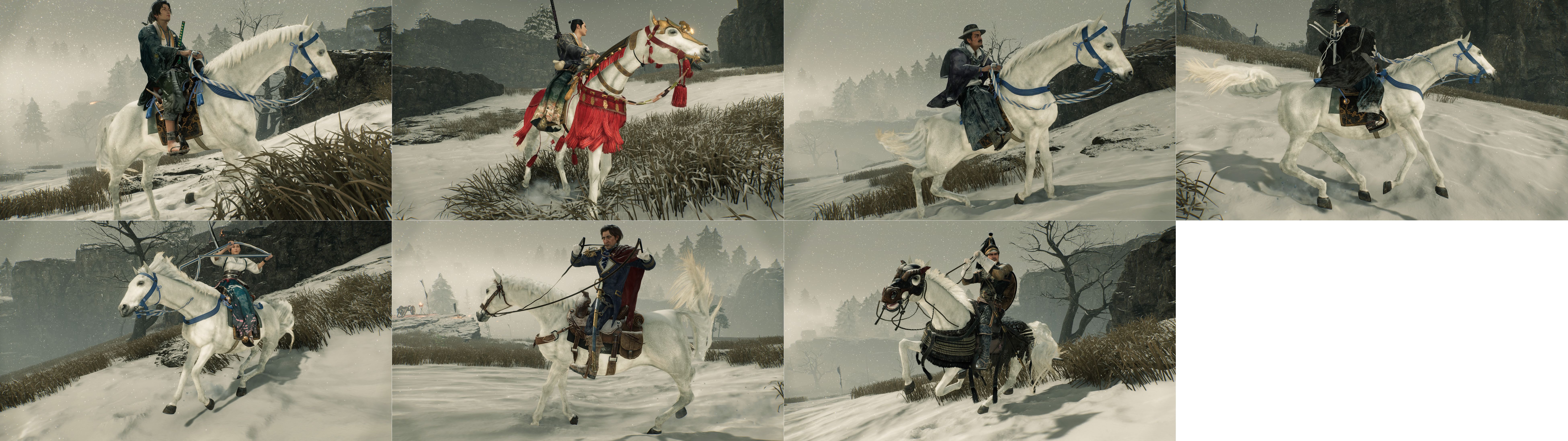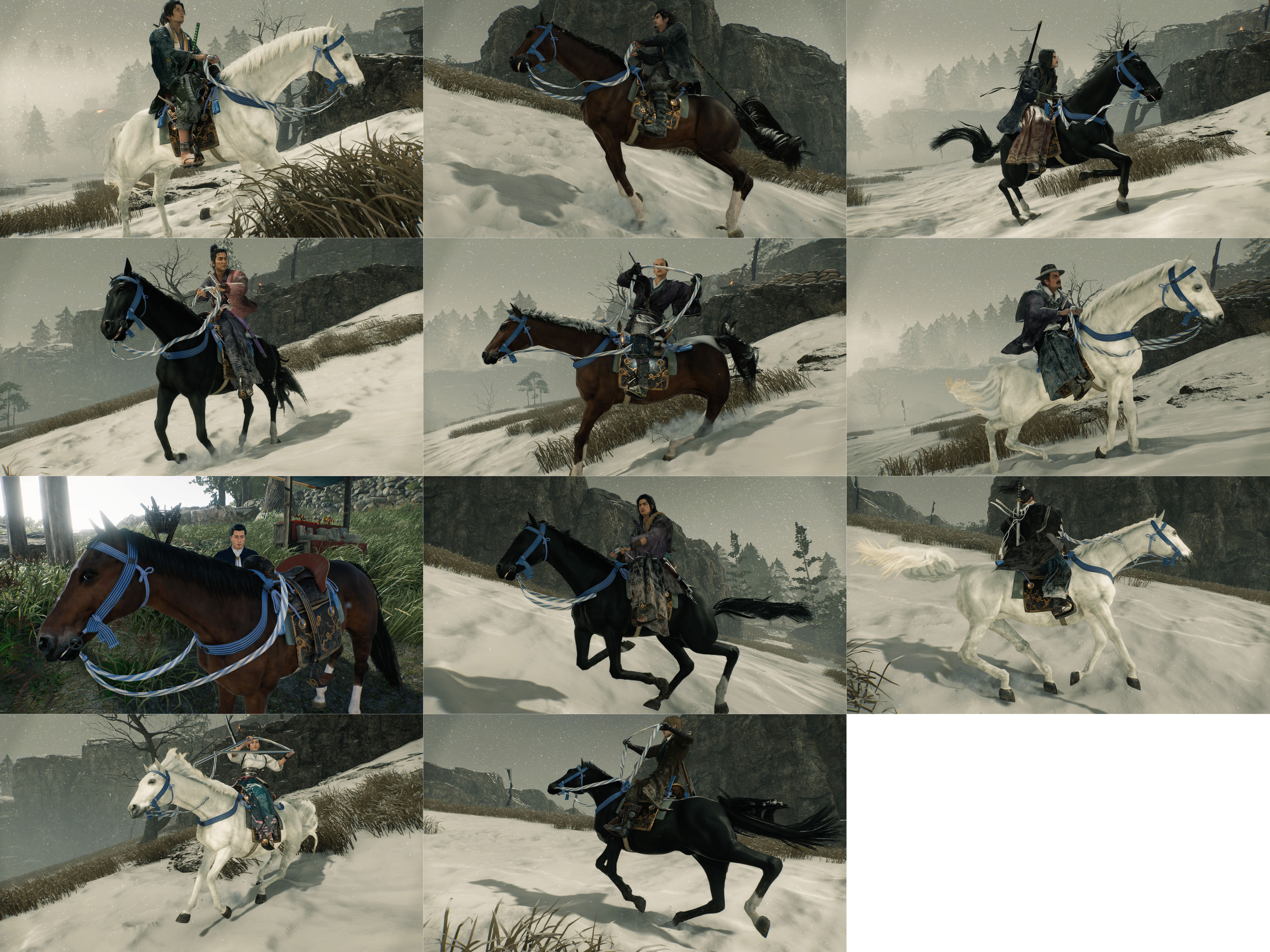 以上を踏まえて、愛馬(?)に乗っている因縁キャラクターは34人確認でき、馬の毛色や馬具はキャラクター毎に設定されているものが異なる。